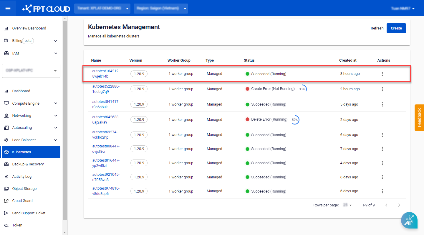 Step 1 : In the menu, select Kubernetes , and the system will display the Kubernetes Management page. Choose a Cluster that you want to upgrade the K8s version.