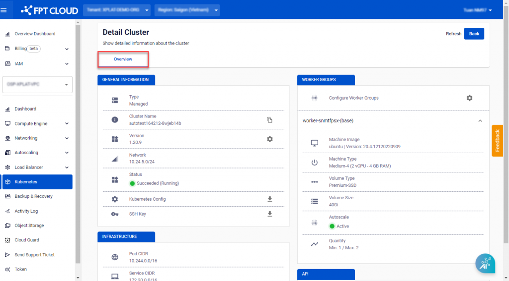 - GENERAL INFORMATION : Basic information about the cluster, including Cluster Name, Kubernetes Version, Network, and Status.