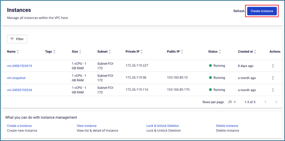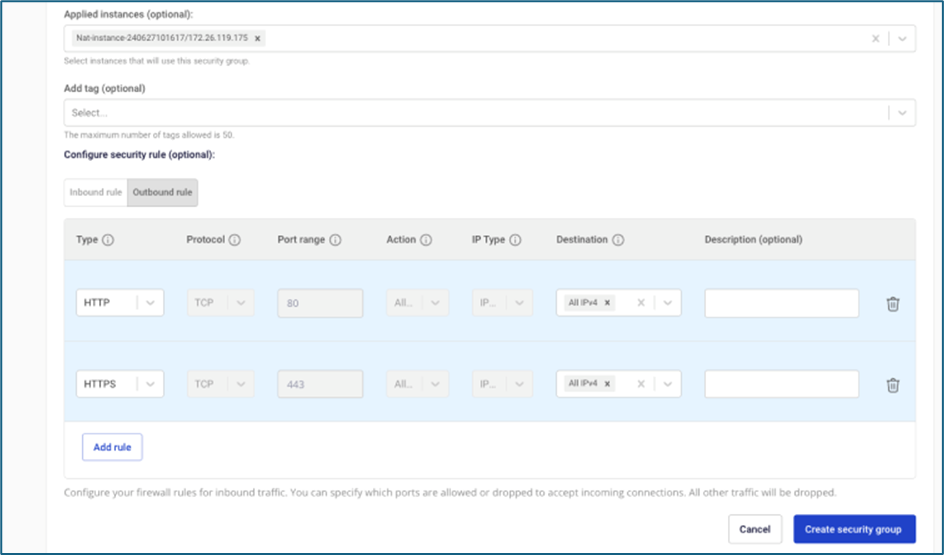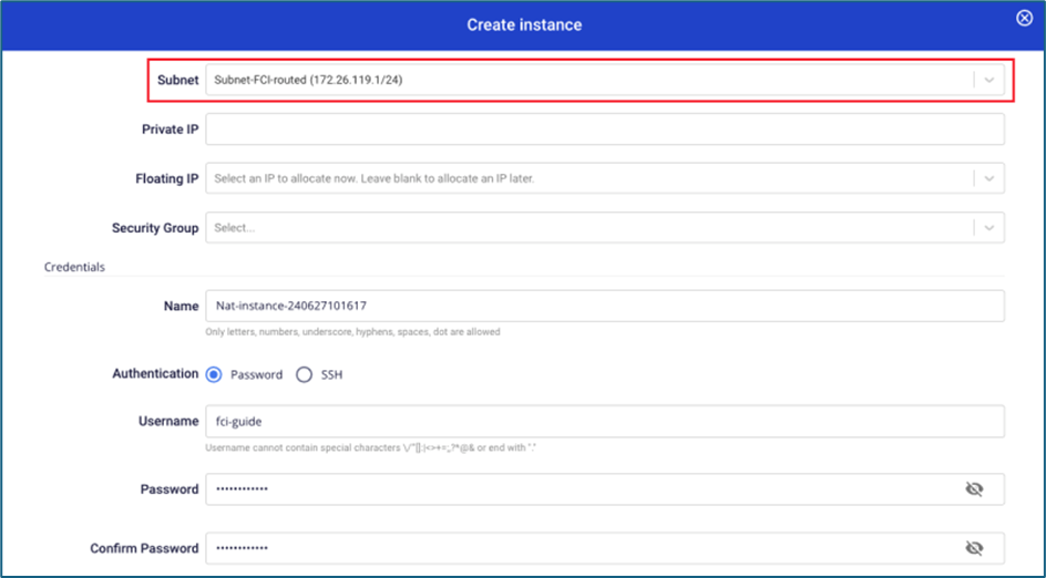 Bước 1 : Tạo Nat instance từ image do FCI cung cấp file file Lưu ý: Trường subnet, cần chọn subnet có thể truy cập Internet. file Bước 2 : Gắn Floating IP cho Nat instance. Trong trường hợp instance đã gắn floating IP từ bước khởi tạo, người dùng không cần thực hiện thao tác này. file file file Bước 3 : Gắn security group cho Nat instance, người dùng mở các rule cần thiết cho instance trong isolated network truy cập ra Internet (có thể mở thêm port ICMP để test ping hệ thống). Trong trường hợp instance đã gắn vào security group từ bước khởi tạo, người dùng không cần thực hiện thao tác này. file file Bước 4 : Add thêm Network interface card (NIC) thuộc subnet trùng với isolated subnet của instance cần truy cập Internet. file file file Bước 5 : Allow address pair 0.0.0.0/0 cho NIC thuộc isolated network file file Bước 6 : Truy cập vào instance thuộc isolated network, chuyển gateway về IP của NIC Nat instance. Trong ví dụ dùng, FCI dùng 1 instance thuộc hệ điều hành Windows. file file file