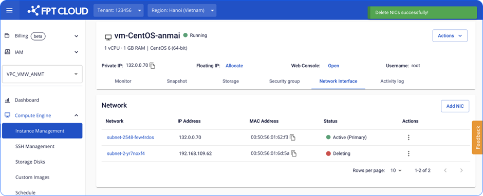 Bước 1 : Chọn Card NIC cần xóa. Đối với card Primary, chức năng này sẽ bị disable. Đối với card thông thường, Unify Portal hỗ trợ xóa khi không có nhu cầu sử dụng. file file Bước 2 : Xác nhận card cần xóa. file Bước 3: Chờ hệ thống xử lý. file Bước 4: Card được xóa thành công và Instance sẽ không thể kết nối qua card này. Để đảm bảo thông tin đồng bộ, các bạn cần thay đổi thông tin về network trong file config của hệ điều hành. Link hướng dẫn nhanh tại: How to change Config file. file