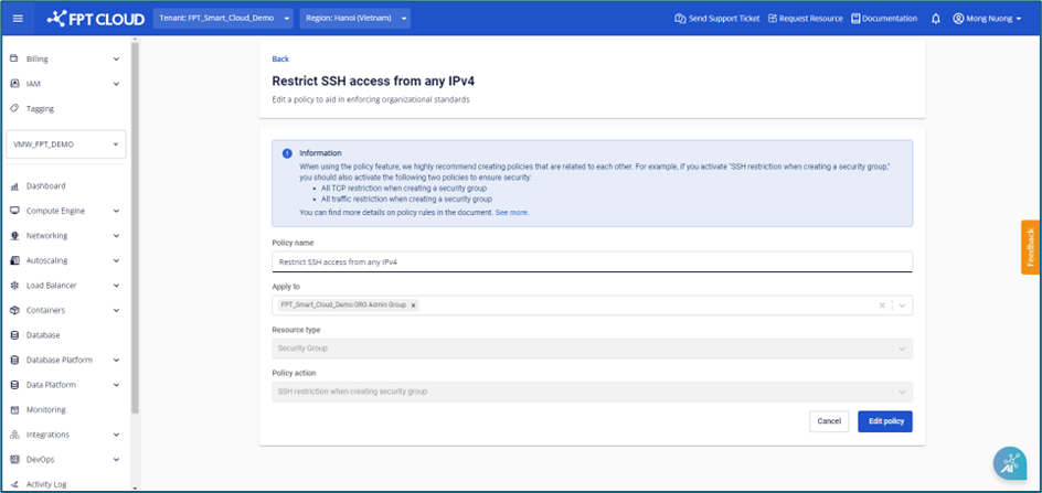 Để sử dụng tính năng Edit policy, người dùng cần đăng nhập vào hệ thống với phân quyền Tenant owner