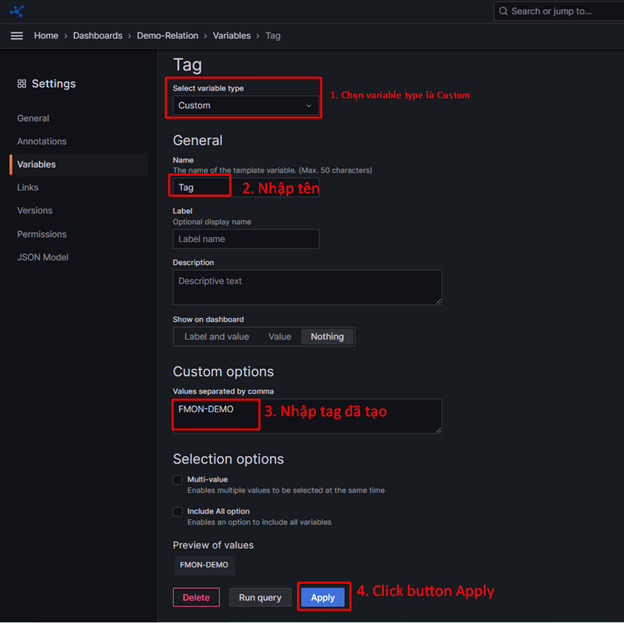 Để tạo một dashboard, người dùng thực hiện như sau: Bước 1 : Vào Home >> Dashboard >> New dashboard Bước 2 : Người dùng sẽ add variable trong dashboard bằng cách click icon Settings >> Chọn Variables >> Add variables Bước 3 : Khai báo tag có trong dashboard. Alt text Sau khi tạo xong sẽ có một variable được khai báo và hiển thị ở màn hình. Alt text Bước 4 : Tạo các biến tương ứng với các component bên trong tag. Alt text Click Apply để lưu biến. Các biến đã khai báo sẽ được hiển thị ở màn hình. Alt text Bước 5 : Save dashboard. Quay lại trang dashboard bằng cách chọn Home >> Dashboard >> Chọn dashboard đã tạo Trên dashboard lúc này sẽ hiển thị các variables mà người dùng đã khai báo. Alt text Bạn có thể add panel theo mong muốn để theo dõi.