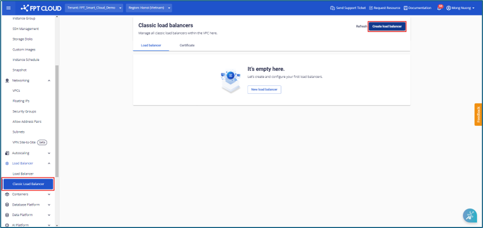 Step 1: In the menu, select Classic load balancer → click Create load balancer.
