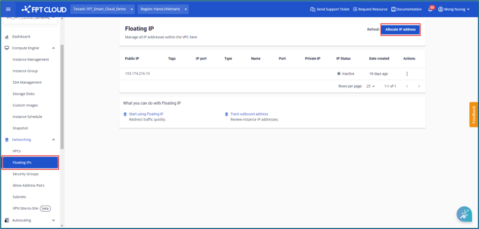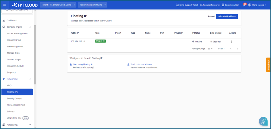 Step 3 : Users fill in other details and click Allocate floating IP to create the IP address. The assigned tags will be displayed in the Tags field on the Floating IP screen.