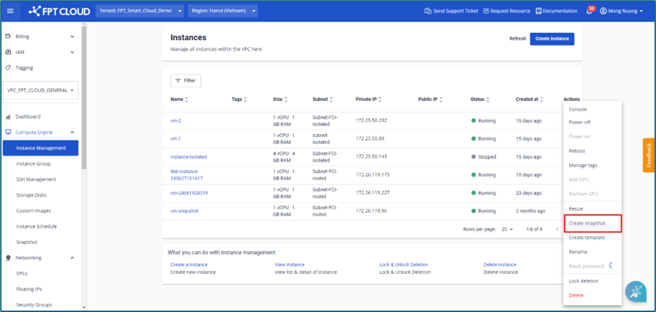 Step 1 : In the menu, select Instance Management , click Actions , then choose Create snapshot.