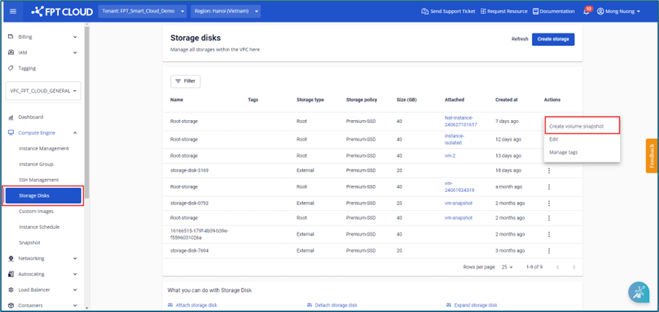 Step 1 : In the menu, select Storage Disk , click Actions , then choose Create volume snapshot.