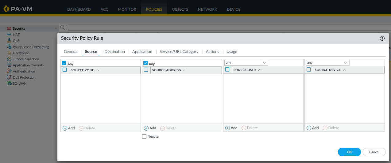 Depending on your environment, configure the source and destination according to the rule.