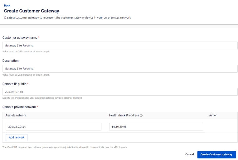 - Remote private network: LAN subnet range for peering with Palo Alto