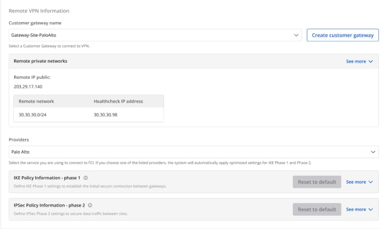 Access and create the VPN Site-to-Site on https://console.fptcloud.com/ -Create a Customer Gateway: