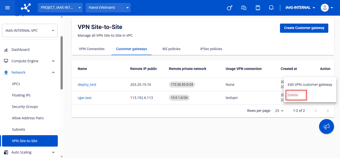 Lưu ý: Chỉ xoá được Customer gateway khi không có VPN Connection nào đang liên kết với gateway (Usage VPN Connection = none) Taị màn hình hiển thị danh sách Customer gateway , nhấn Delete tại mục Action của Customer gateway cần xoá. file Một hộp thoại hiện ra, gõ delete và nhấn Delete Customer gateway để xoá hoặc Cancel để huỷ bỏ. file