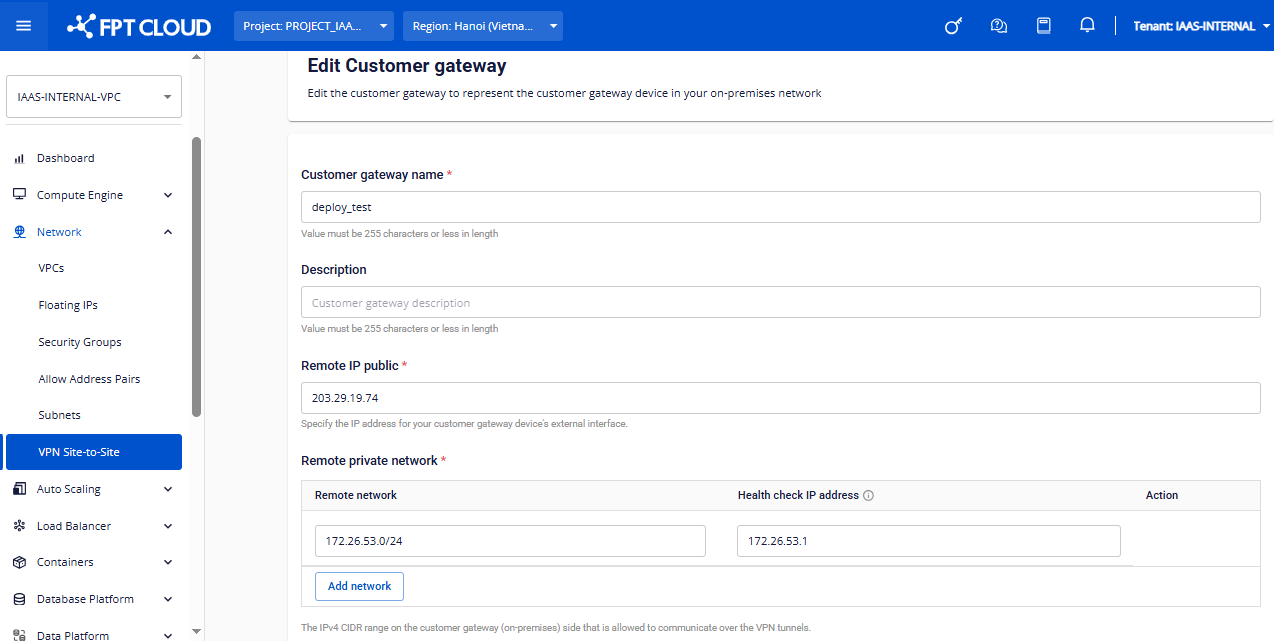 Lưu ý: Chỉ chỉnh sửa được Customer gateway khi CGW không được gán vào VPN connection Để chỉnh sửa Customer gateway , người dùng thao tác theo hướng dẫn sau: Bước 1: Tại màn hiển thị danh sách Customer gateway, nhấn Edit Customer gateway tại mục Action của Customer gateway cần chỉnh sửa. file Bước 2: Tại đây, người dùng chỉnh sửa các thông tin bao gồm: file