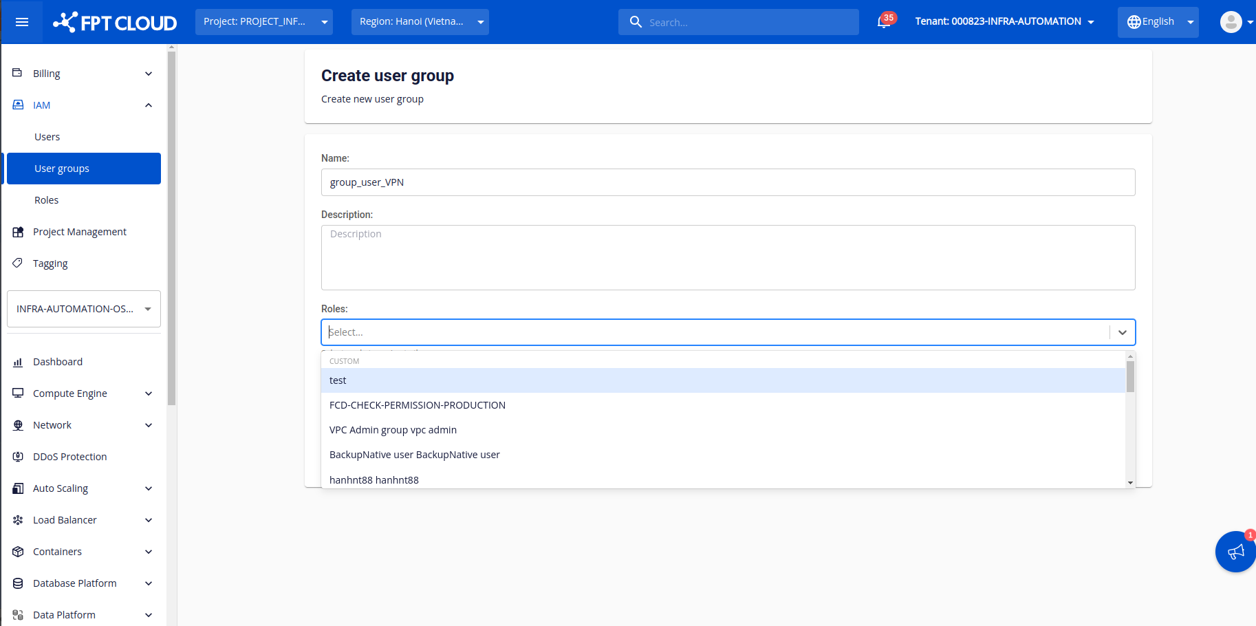 Bước 5: Khởi tạo user group và chọn roles “VPN_user” vừa khởi tạo ở bước trên