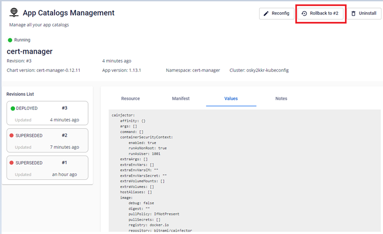 Hệ thống cho phép người dùng có thể rollback applications về cấu hình cũ Bước 1 : Tại màn hình xem chi tiết thông tin app chọn Rollback to # Bước 2 : Nhập Rollback để xác nhận thông tin Bước 3 : Kiểm tra thông tin sau khi rollback: