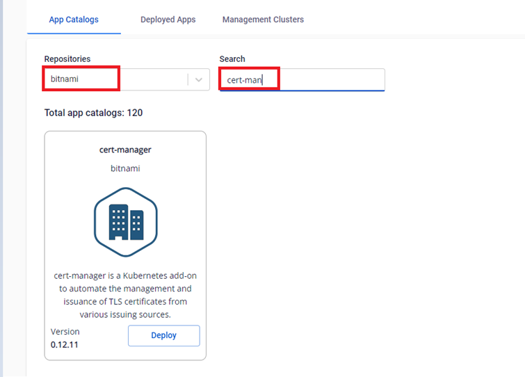Ví dụ chọn repository là bitnami, thực hiện tìm kiếm chart cert-manager của bitnami để deploy tới cluster.