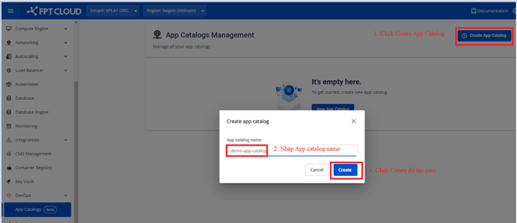 • Bước 2 : Nhấn chọn Create App Catalog > Nhập thông tin để khởi tạo một AppCatalog