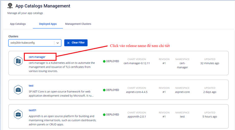 FPT Cloud cho phép người xem chi tiết thông tin app đã được deploy như sau: Bước 1 : Chọn app đã được deploy Bước 2 : Xem chi tiết thông tin của app đã được deploy bao gồm: