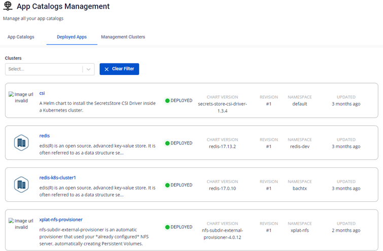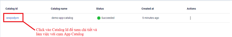 Để làm việc với cụm App Catalog đã được khởi tạo, đầu tiên bạn vào xem thông tin chi tiết của cụm đã được khởi tạo. Xem thông tin chi tiết của cụm, Click vào Catalog Id để xem thông tin chi tiết Với một App Catalogs Management, bạn sẽ được cung cấp thông tin chi tiết App Catalog tương ứng với từng repository, thực hiện quản lý các k8s cluster để deploy applications.