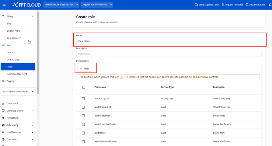 Để xem được billing, người dùng cần có role Tenant owner (Super Admin) hoặc role có permission billing. Với những user không có role Tenant owner (Super Admin) cần xem billing, user Tenant owner (Super Admin) có thể phân quyền theo hướng dẫn dưới đây: Bước 1: User có quyền Tenant Owner (Super Admin) đăng nhập vào Console.FPTcloud > chọn IAM > chọn Roles > chọn button Create Role. file Bước 2: Tại màn hình Create Role, đặt tên cho role tại field “Name” > Chọn filter để chọn permission cho role này > Chọn type = billing > chọn permission cho role này > chọn button Create. file file file Bước 3: Tại IAM, chọn User Groups > Chọn Create user group. file Bước 4: Tại màn hình Create user group, điền Name cho user group > chọn roles billing mà bạn đã tạo ở bước 1-2 > chọn các user mà bạn muốn phân quyền với role đã chọn > bấm Create user group. file