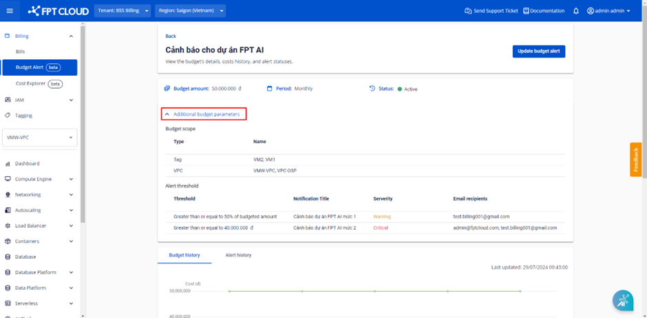 Bước 1: Tại menu, chọn Billing > Chọn Budget Alert. Hệ thống hiển thị danh sách Budget Alert list đã tạo> Chọn Budget Alert Name.