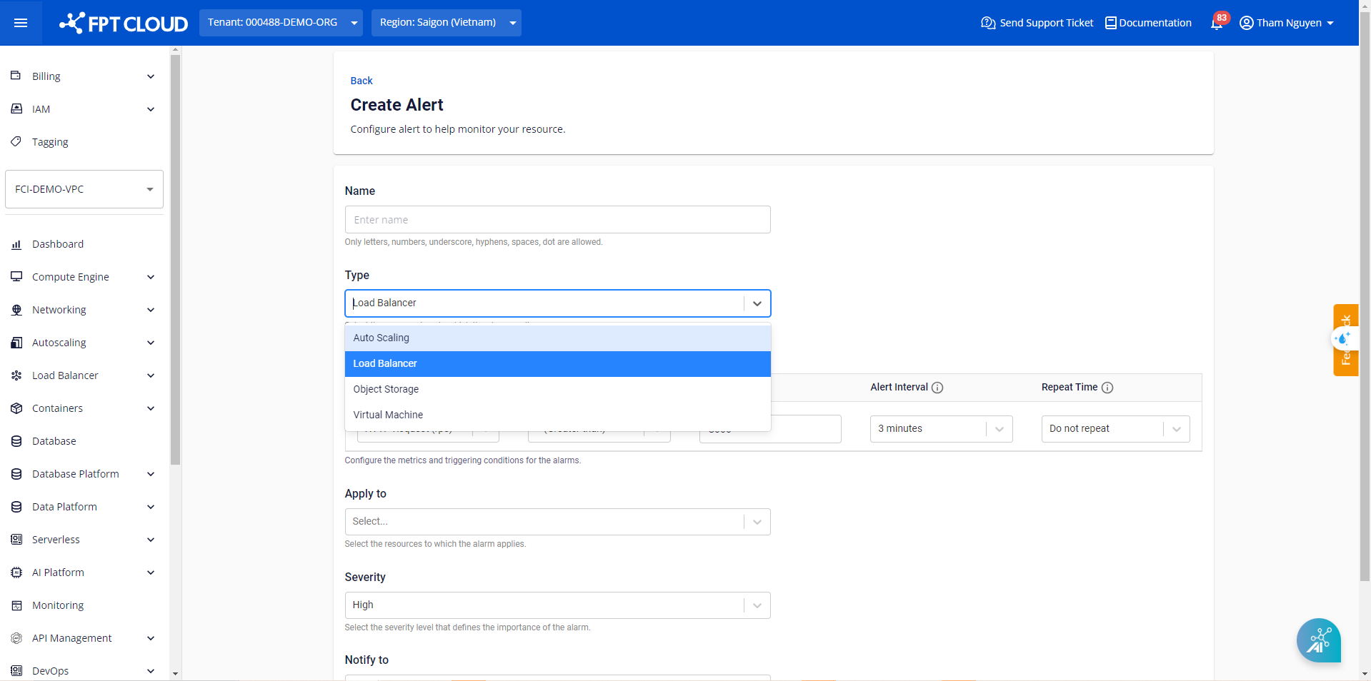 Để thực hiện tạo cảnh báo cho dịch vụ Load balancer đang sử dụng, chọn Type là Load Balancer