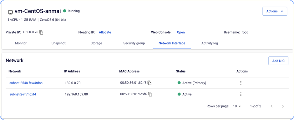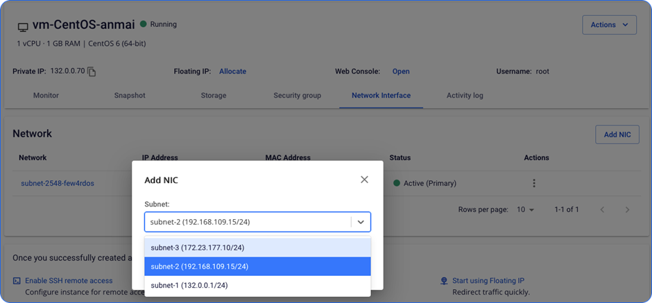Unify Portal hỗ trợ tính năng thêm mới card NIC dễ dàng và linh hoạt, tùy thuộc vào nhu cầu của khách hàng. Thao tác thêm mới được thực hiện một cách đơn giản và tiện lợi. Bước 1 : Chọn Add NIC. file Bước 2 : Chọn Subnet theo nhu cầu. file file file Bước 3: Chờ hệ thống xử lý. Tại đây, hệ thống sẽ cấp ngẫu nhiên một địa chỉ IP trong Subnet trên. file Bước 4: Card chuyển sang trạng thái Active, và Instance có thể kết nối mạng qua card này. file