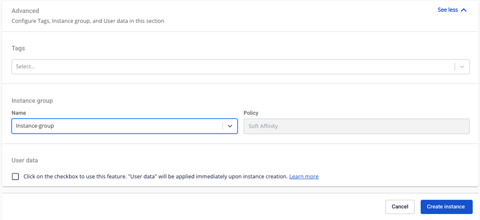 Tính năng áp dụng cho người dùng sử dụng dịch vụ General và Specific. Khi người dùng khởi chạy một máy ảo, người dùng có thể truyền thông tin về nhóm máy chủ như một gợi ý để thực hiện việc đặt máy ảo theo chính sách mong muốn. Để thực hiện điều này, người dùng cần tiến hành các thao tác đơn giản sau: Lưu ý là mỗi instance group chỉ có thể gắn với tối đa 10 instances. Bước 1 : Ở menu chọn Instance Management > chọn Create instance , trong phần Instance Group , chọn Name của instance group người dùng muốn đặt máy ảo file Bước 2 : Nhấn Create instance. Hệ thống sẽ tiến hành khởi tạo và thông báo kết quả. Nếu thành công, thông tin về instance group sẽ được hiển thị ở trang Instance Detail. file