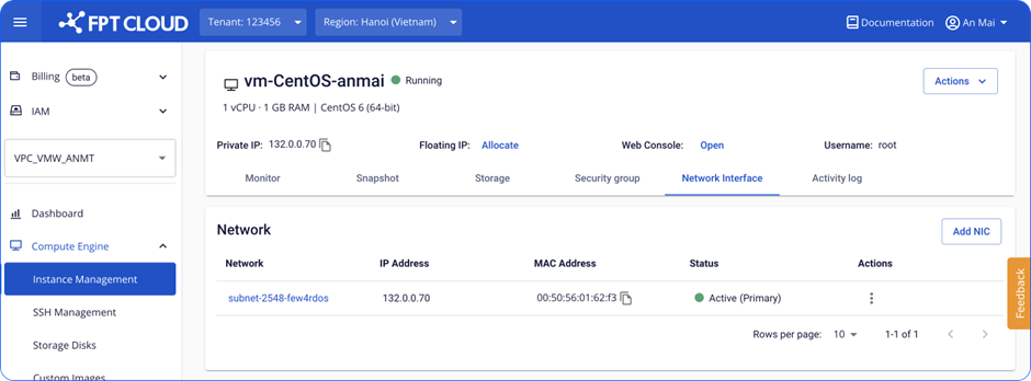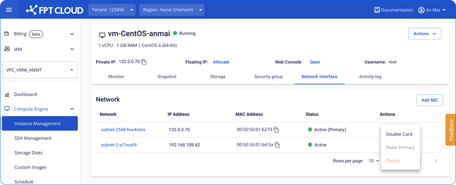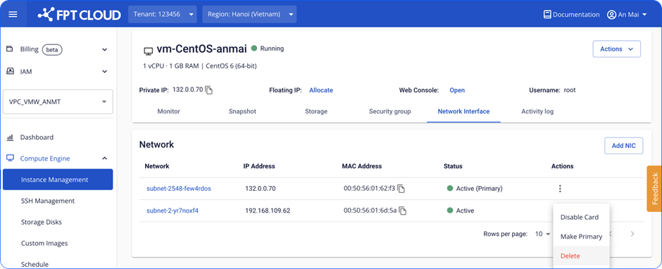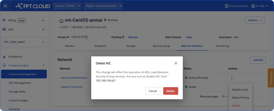 Bước 1 : Chọn Card NIC cần xóa. Đối với card Primary, chức năng này sẽ bị disable. Đối với card thông thường, Unify Portal hỗ trợ xóa khi không có nhu cầu sử dụng. file file Bước 2 : Xác nhận card cần xóa. file Bước 3: Chờ hệ thống xử lý. file Bước 4: Card được xóa thành công và Instance sẽ không thể kết nối qua card này. Để đảm bảo thông tin đồng bộ, các bạn cần thay đổi thông tin về network trong file config của hệ điều hành. Link hướng dẫn nhanh tại: How to change Config file. file