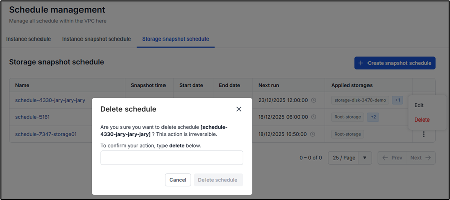 Bước 1: Trên tab Storage snapshot schedule, chọn tên của lịch phần action, chọn Delete