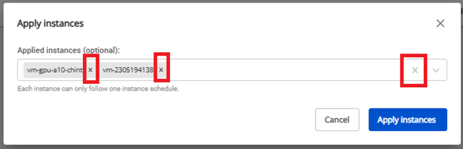 Bạn có thể gỡ các máy ảo ra khỏi schedule khi không còn nhu cầu sử dụng. Sau khi gỡ, máy ảo sẽ đứng yên ở trạng thái lúc gỡ đến khi nào bạn thao tác tay lại mới thay đổi. Bước 1 : Trên bảng quản trị Instance Schedule Management, trong phần Action , chọn Apply instances Bước 2 : Chọn dấu “x” bên cạnh tên các instances muốn gỡ để thực hiện thao tác gỡ máy ảo khỏi schedule (bạn cũng có thể click vào dấu “x” ở cuối listbox để gỡ cùng lúc toàn bộ máy ảo khỏi schedule), sau đó chọn Apply instances. file