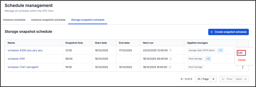 Bước 1: Trên tab Storage snapshot schedule, chọn tên của lịch phần action, chọn Edit file Bước 2: Chỉnh sửa các thông tin của lịch theo nhu cầu file Bước 3: Bấm Update schedule, nếu thành công, lịch mới sẽ được cập nhật trên hệ thống.