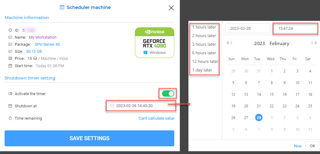 Một hộp thoại cài đặt thời gian tắt máy được mở ra, chọn thời gian mong muốn và nhấn Save settings để hoàn tất cài đặt