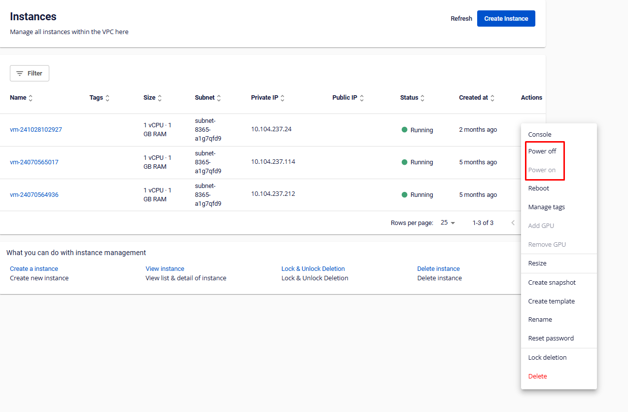 Với các máy chủ đã tạo trên FPT Cloud , bạn có thể bật hoặc tắt tương tự khi sử dụng máy chủ vật lý. Lưu ý: Do các tài nguyên đã được cấp phát cố định cho máy chủ của bạn nên khi máy chủ ở trạng thái Tắt , hệ thống vẫn sẽ phát sinh các chi phí tương tự khi đang ở trạng thái Bật , dù bạn có sử dụng hay không. Trên bảng quản trị Instance Management , trong phần Action , chọn menu Power. Tại đây, các thao tác có thể thực hiện được: