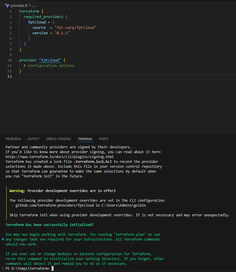 • Sử dụng lệnh “terraform init” để cài đặt FPT Cloud Provider: