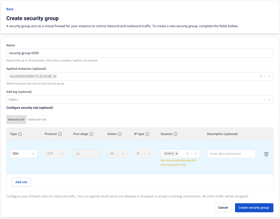 Để kết nối vào các máy ảo nhân Linux (Ubuntu , CentOS ,..) bằng SSH Client , Bitvise , PuTTY ,... Máy ảo cần được gắn Floating IP và đã mở port SSH cho SSH Connection. FPT Cloud hỗ trợ mở port cho máy ảo bằng cách gắn một Security Group. Bước 1 : Khởi tạo 1 máy ảo hệ điều hành Linux , gắn Floating IP theo hướng dẫn ở phần Quản lý Floating IP và khởi chạy. Userguide FPT Cloud Server 2022 29 Bước 2 : Gắn vào máy ảo một Security Group đã mở port SSH , nếu chưa có Security Group có thể tạo mới theo hướng dẫn ở phần Quản lý Security Group file Bước 3 : Sau khi cấu hình thành công, người dùng có thể connect vào máy ảo từ các SSH Client bằng các thông tin: Floating IP , Port SSH , file SSH Key hoặc Password. Nếu vẫn không thể kết nối được, người dùng nên kiểm tra lại máy ảo đã bật chưa, Floating IP có chính xác không và mở lại port SSH theo các hướng dẫn ở phần Quản lý Security Group.