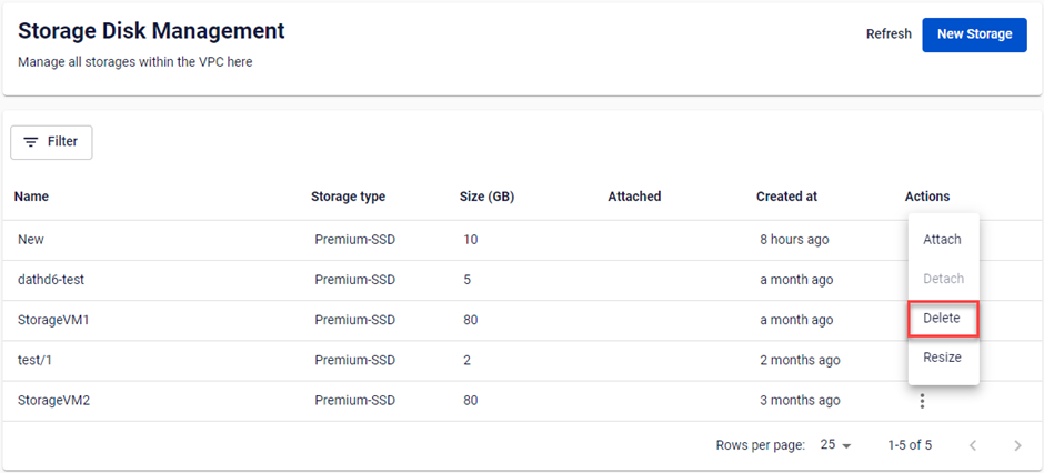 Nếu không còn nhu cầu sử dụng, người dùng có thể xóa Storage Disk khỏi VPC để tránh phát sinh chi phí. Lưu ý: Chỉ có thể xóa Storage Disk đang không gắn vào instance nào. Sau khi xóa, dữ liệu trong Storage Disk không thể hồi phục lại. Hãy cẩn thận với hành động này. Bước 1: Chọn Actions ở cuối Storage Disk cần xóa trên danh sách. Chọn Delete. file Bước 2: Xác nhận thông tin cảnh báo trong popup và chọn Delete storage disk. file