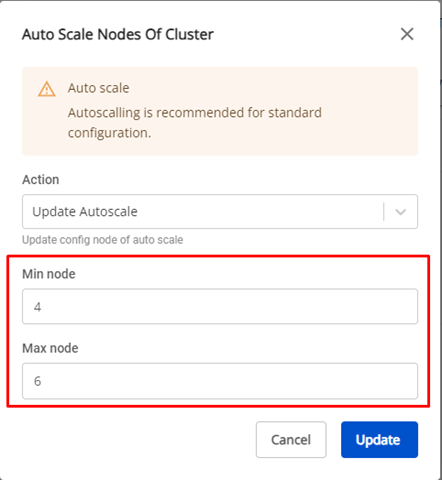 • Min node/ Max node: Nhập số lượng worker nodes muốn thêm/bớt.