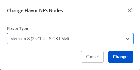 Bước 1 : Ở menu chọn Kubernetes , hệ thống sẽ hiển thị trang Kubernetes Management. Bước 2 : Chọn Cluster muốn thay đổi cấu hình nodes trên danh sách. Bước 3 : Chọn tab Advanced , bạn có thể thay đổi Flavor (cấu hình CPU, RAM) của NFS Server bằng cách chọn icon Setting ở config tương ứng. Bước 4 : Chọn cấu hình mong muốn > Chọn Change để thực hiện thay đổi.