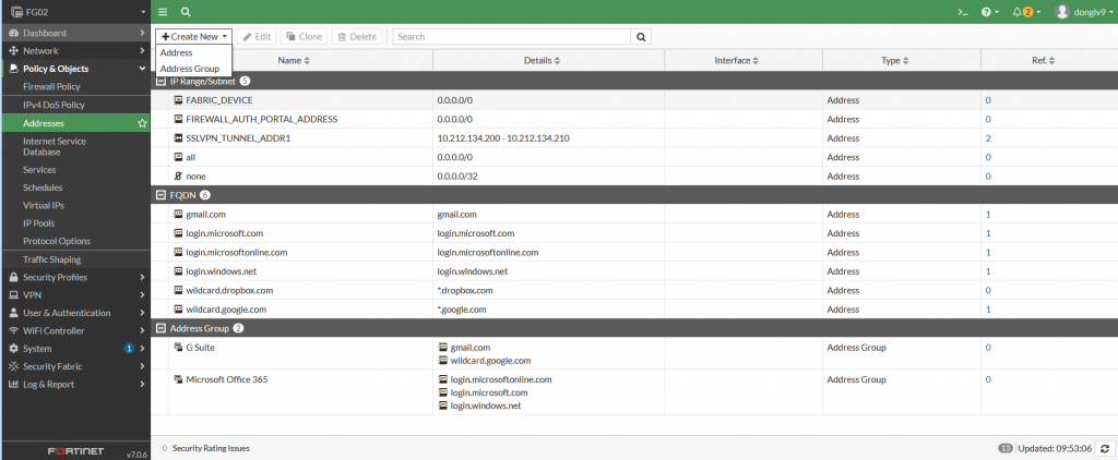 Bước 1: Cấu hình Firewall Address (định nghĩa các IP Address sử dụng):
