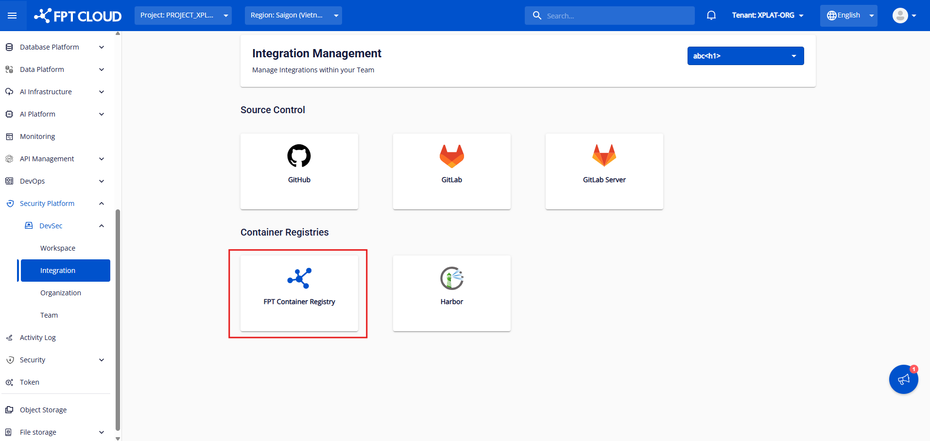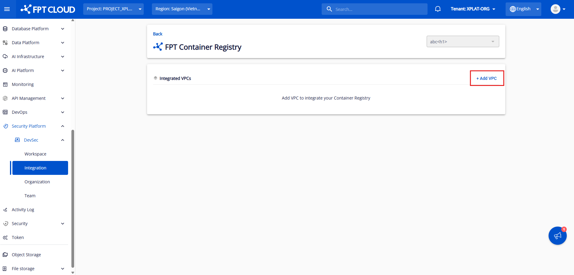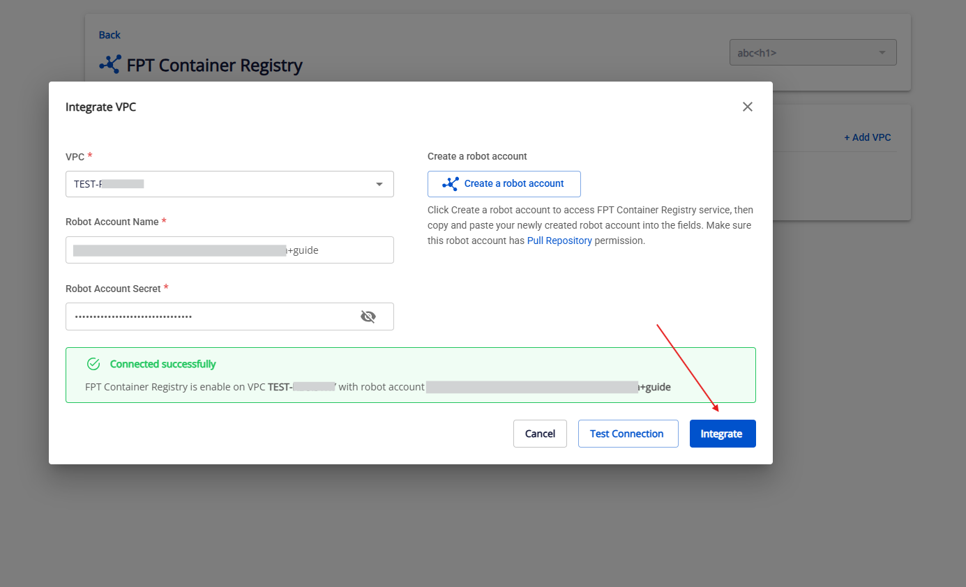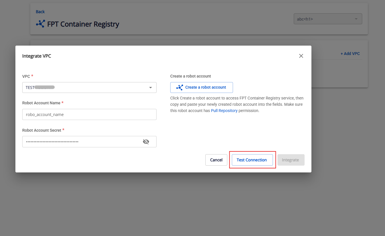 Bước 1 : Sau khi đã chọn org/team, nhấn vào FPT Container Registry để đến màn tích hợp: anhfsec Bước 2 : Nhấn vào Add VPC để thêm VPC mới vào danh sách tích hợp anhfsec Bước 3 : Chọn VPC cần tích hợp anhfsec Bước 4 : Sau khi chọn VPC, nếu bạn đã có Robot Account, điền Robot Account Name , nếu bạn chưa có Robot Account, hãy xem phần hướng dẫn tại đây. anhfsec Bước 5 : Điền tênsecret của Robot Account anhfsec anhfsec Bước 6 : Sau khi điền hết thông tin, nhấn Test Connection. Hệ thống sẽ kiểm tra thông tin các trường bắt buộc, nếu thông tin hợp lệ, hệ thống thông báo Connected successfully và nút Integrate được enabled anhfsec Trường hợp các thông tin không hợp lệ (sai Robot Account, secret), hệ thống thông báo "Connected failed". Bước 7 : Sau khi hệ thống thông báo test kết nốt thành công, nhấn Integrate anhfsec VPC được kết nối thành công sẽ được thêm vào danh sách Integrated VPCs anhfsec