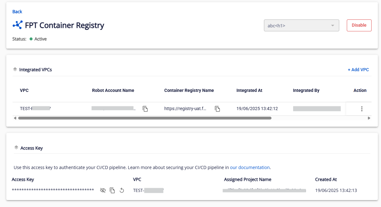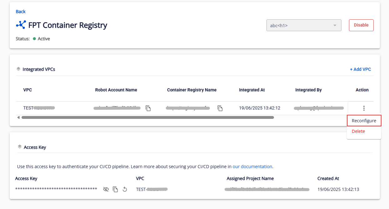 Chỉ Org AdminTeam Manager có quyền xem chi tiết tích hợp Sau khi đã chọn org/team, nhấn vào Configured FPT Container Registry để xem chi tiết anhfsec Ở đây, bạn có thể xem trạng thái của tích hợp, danh sách Integrated VPCs với các thông tin VPC, Robot Account Name, Container Registry NameAccess Key phục vụ cho tích hợp CICD. anhfsec Bạn có thể tiến hành Add VPC , Reconfigure , và Delete VPCs hoặc Disable tích hợp với FPT Container Registry anhfsec