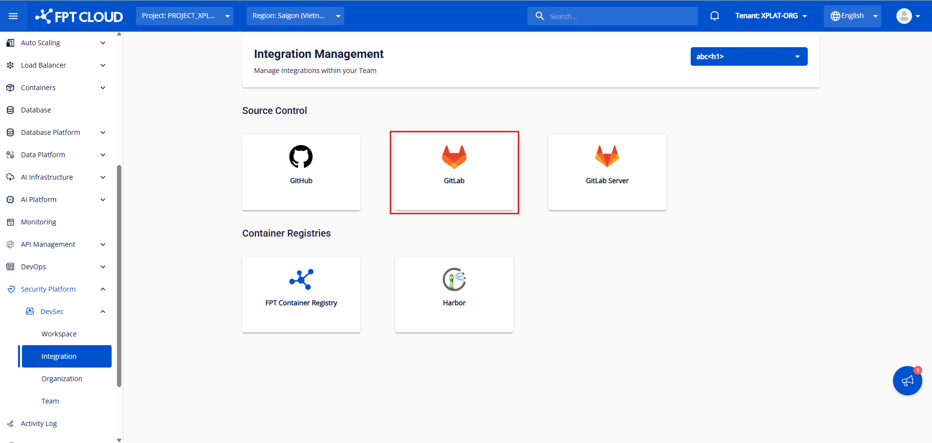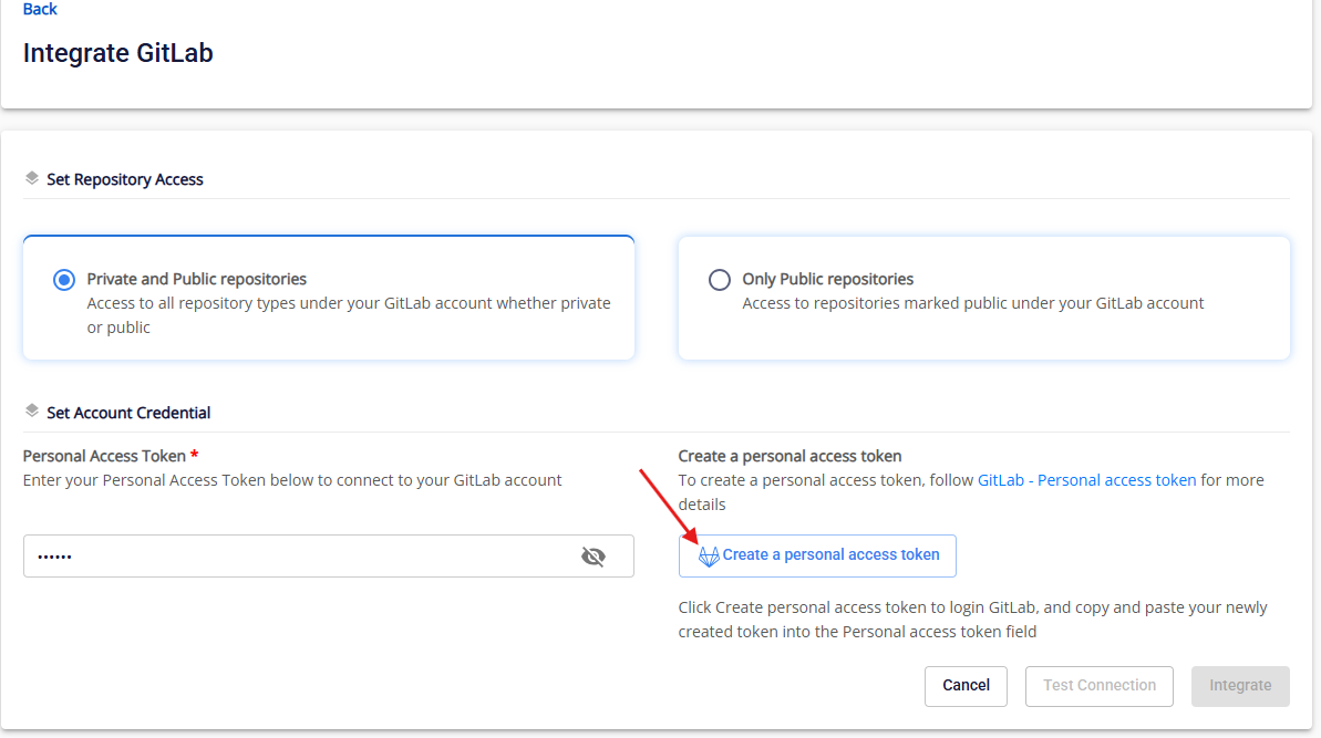 Bước 1 : Sau khi đã chọn org/team, nhấn vào GitLab để đến màn tích hợp GitLab Cloud: anhfsec Bước 2 : Sau khi thiết lập quyền truy cập vào Private/public repository, nhấn vào Create a personal access token , sau đó bạn sẽ được chuyển đến GitLab Login để tạo token anhfsec Bước 3 : Điền thông tin như Token nameToken Description và tích vào read_api anhfsec anhfsec Bước 4 : Copy personal access token anhfsec Bước 5 : Điền Personal Access Token vừa tạo và nhấn Test Connection anhfsec Lúc này hệ thống sẽ kiểm tra các miền bắt buộc và valid Personal Access Token , nếu một trong hai failed, màn hình sẽ hiển thị thông báo Test connection Failed(invalid PAT) Nếu thành công, màn hình sẽ hiển thị Test connect successfully Bước 6 : Nhấn vào Integrate anhfsec