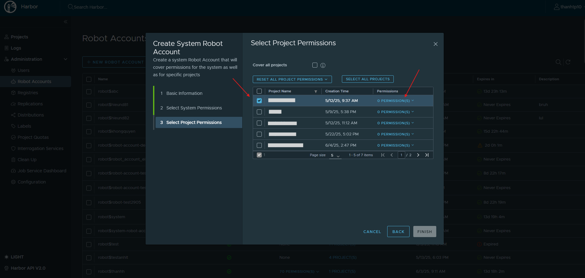 Bước 1 : Truy cập Harbor Server của bạn, chọn tab Administration > Robot Accounts Bước 2 : Nhấn New Robot Account để tạo mới anhfsec Bước 3 : Điền các thông tin như Name , DescriptionExpiration time sau đón nhấn anhfsec Bước 4 : Chọn các quyền hệ thống cần thiết sau đó nhấn anhfsec Bước 5 : Chọn các Project mà Robot Account cần có quyền sau đó chọn Permission cho Robot Account đó. Cần đảm bảo Robot Account có quyền List, Read Artifacts và quyền List, Pull, Read Repository anhfsec anhfsec Bước 6 : Sau khi điền hết thông tin, nhấn Finish anhfsec Bước 7 : Sau khi Robot Account được tạo thành công, copy Robot Account namesecret dùng cho tích hợp tại màn hình của FPT Portal anhfsec
