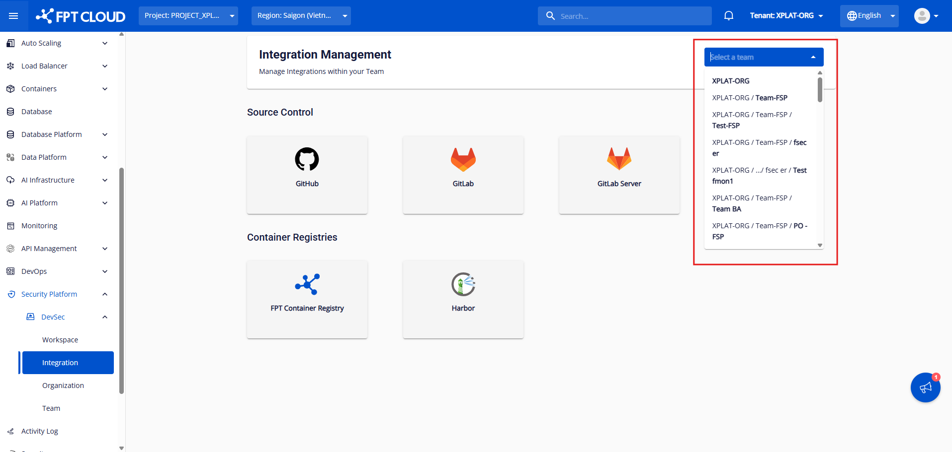 Chỉ Org Admin hoặc Team Manager có quyền chỉnh sửa Bước 1 : Đến tab DevSec trong menu Security Platform, chọn Integration để xem được danh sách integration. Tiến hành chọn Org hoặc Team của bạn: anhfsec Note: Các loại tích hợp sẽ bị disabled và bạn không thể chọn tích hợp khi chưa chọn org/team Bước 2 : Chọn loại Source Control hoặc Container Registry cần tích hợp: anhfsec