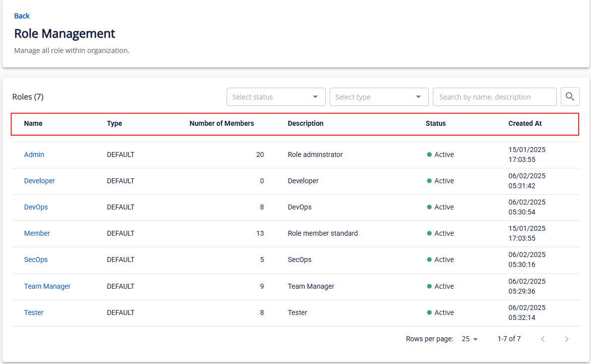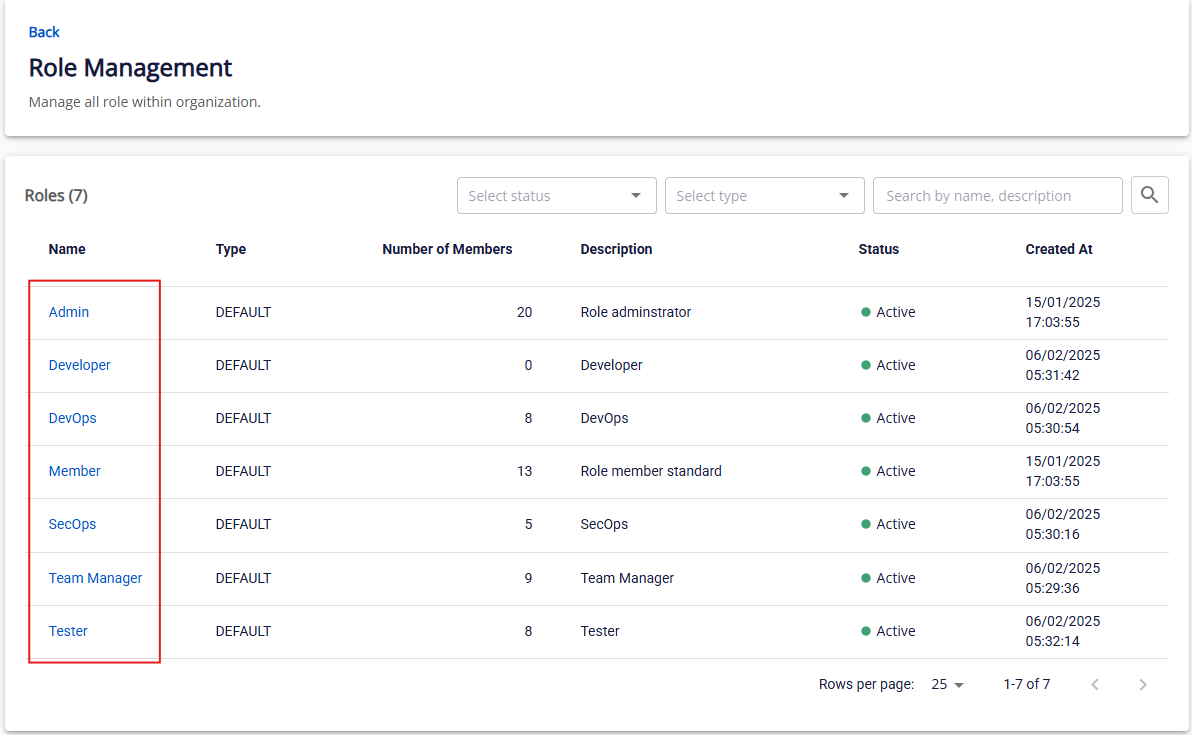 Chỉ Org Admin có quyền chỉnh sửa Bước 1 : Nhấn vào thẻ RolesOrgaization để xem danh sách vai trò của các thành viên anhfsec Lúc này bạn có thể xem Name , Type , Number of Members , Description , Role , Status , Created at và có thể tìm kiếm dựa theo các đầu mục trên anhfsec Bước 2 : Nhấn vào HyperlinkRole name để xem vai trò và quyền hạn của các thành viên anhfsec Dưới đây là hiển thị thông tin của thành viên bao gồm Name , Description , Created atStatusPermission của Role. anhfsec