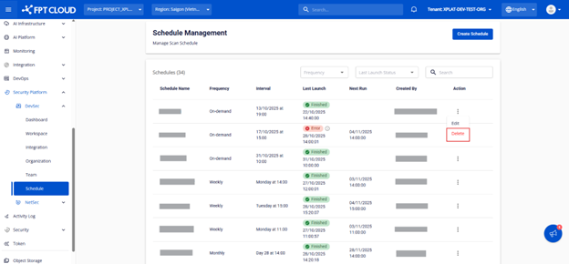 Tại màn hình Schedule Management, chọn chọn dấu ⋮ ở mỗi schedule > Delete để thực hiện xóa 1 schedule: Alt text Hệ thống hiển thị pop-up confirm, nhập “delete” rồi ấn Confirm để xác nhận xóa schedule: Alt text