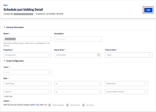 Cách 1 : Tại màn hình Schedule Management, chọn dấu ⋮ ở mỗi schedule > Edit để chỉnh sửa schedule: Alt text Hệ thống điều hướng sang màn hình edit, người dùng có thể chỉnh sửa schedule theo ý muốn: Alt text Cách 2 : Tại màn hình Schedule Detail , nhấn nút Edit tại góc bên phải màn hình: Alt text