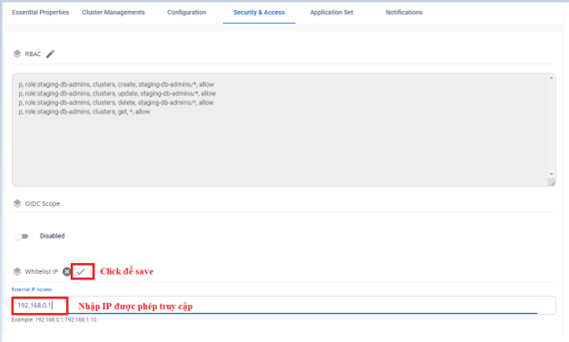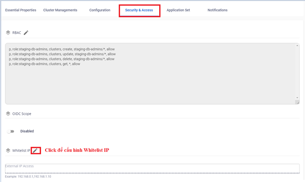 FPT Cloud hỗ trợ người dùng cấu hình whitelistIP truy cập vào URL ArgoCD thông qua giao diện Portal như sau: Bước 1: Vào màn hình Security & Access > Whitelist IP Bước 2: Nhập IP cho phép truy cập vào Argo CD Lưu ý: Các IP cách nhau bởi dấu “,” Bước 3: Kết quả sau khi cấu hình Bước 4: Kiểm tra kết quả sau khi cấu hình Truy cập ArgoCD thông qua trình duyệt, xuất hiện lỗi 403