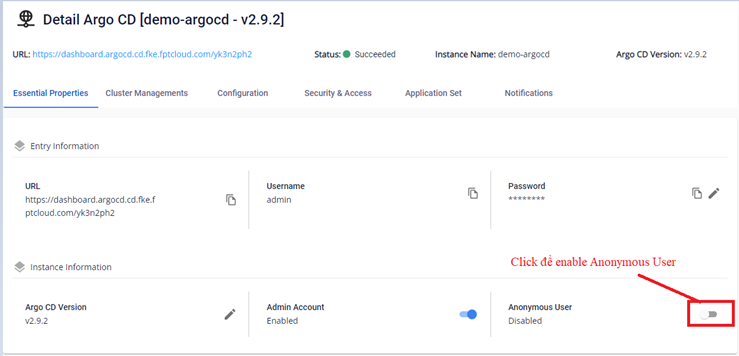 Người dùng có thể bật/tắt quyền truy cập ẩn danh vào ArgoCD thông qua giao diện portal. Anonymous user sẽ sử dụng quyền mặc định với role là readonly (chỉ đọc) đối với các chức năng trên ArgoCD. Mặc định trong ArgoCD sẽ tắt quyền truy cập ẩn danh. A. Enable Anonymous User