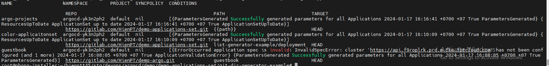Bước 3: Kết quả sau khi tạo applications với applicationsSet List Appset sau khi sử dụng cli để get list: