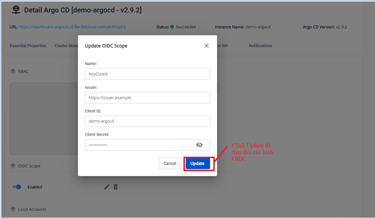 • Bước 2 : Thực hiện Update thông tin OIDC muốn thay đổi, người dùng có thể thực hiện thay đổi các thông tin sau bao gồm: Name/Issuer/ClientID/Client Secret